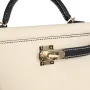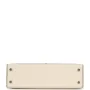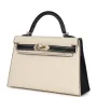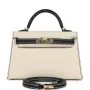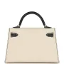 This Special Order Kelly, in the Sellier style, is in Craie and Black Epsom leather with permabrass hardware and has contrast stitching, two straps with front toggle closure, single rolled handle and removable shoulder strap.