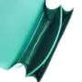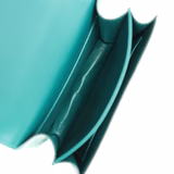 The interior is lined with Malachite lambskin and has an open pocket on the front wall, a center divide, and a slit pocket on the back wall.