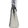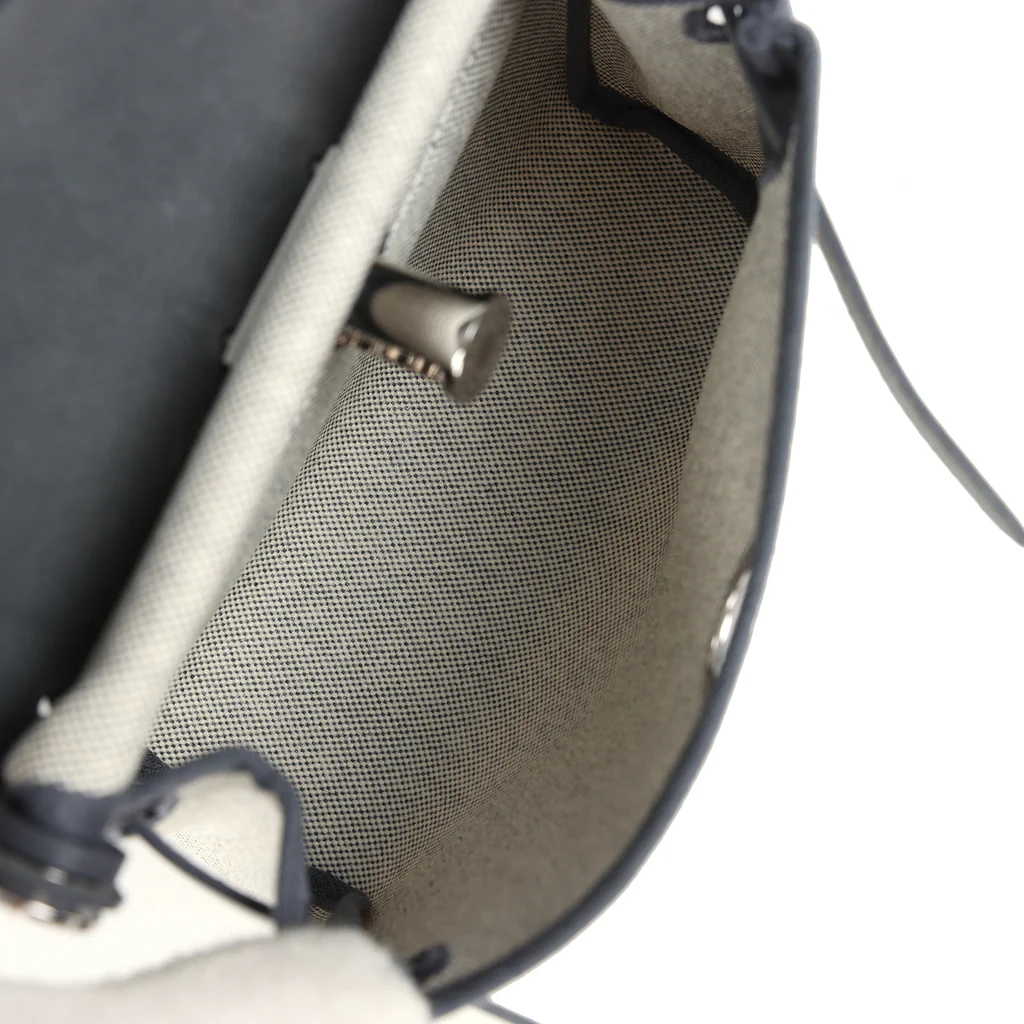 This Hermes Herbag Zip 20 Mini Ecru and Ardoise Toile H canvas and Ardoise Vache Hunter leather with palladium hardware has tonal stitching, front flap, two straps with center clou de selle closure, back zip pocket and black shoulder strap.
